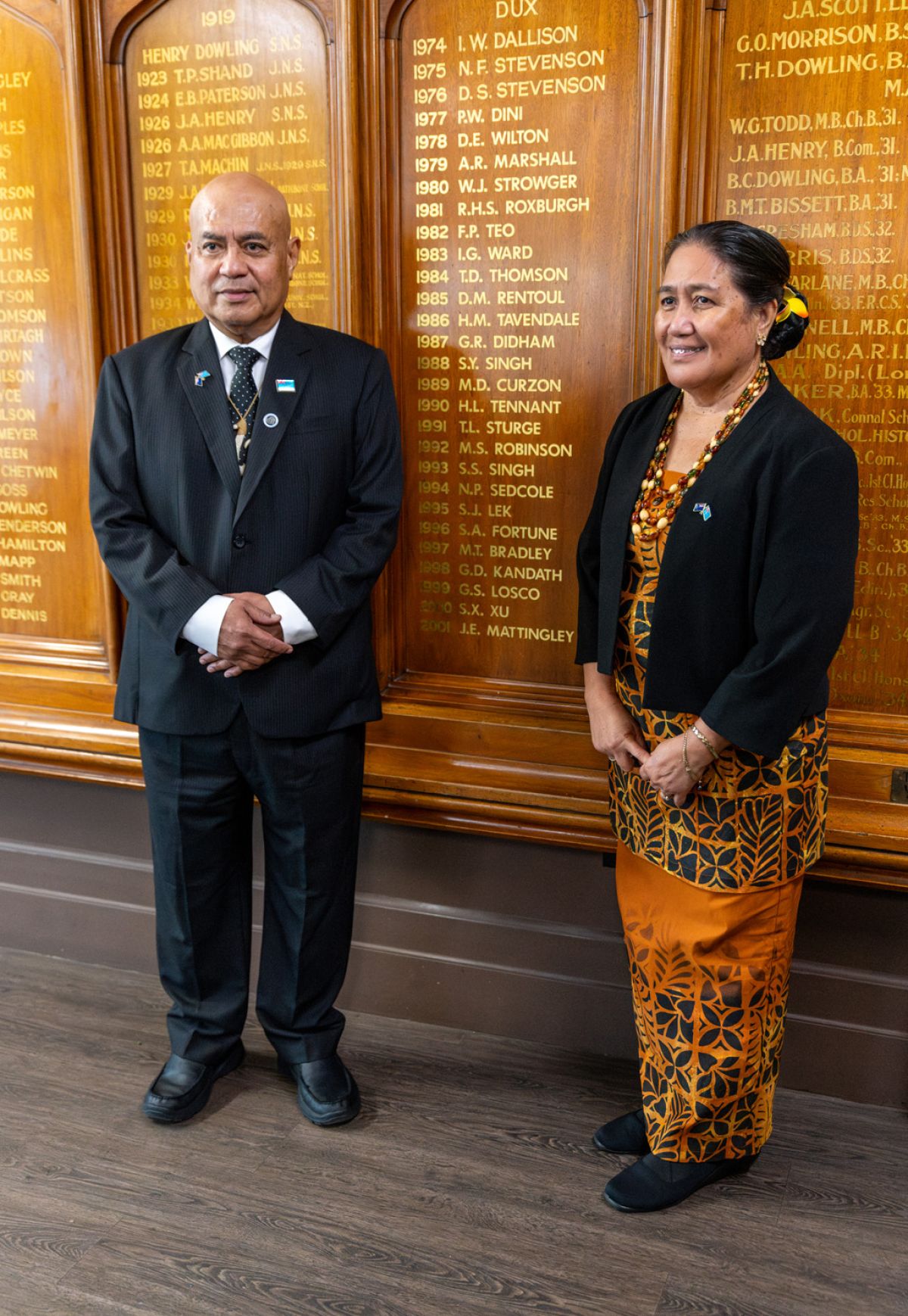 The Honourable Feleti Teo OBE (OC 1982), Prime Minister of Tuvalu and Madame Tausaga Teo beside the Dux Honours Board, Strowan House